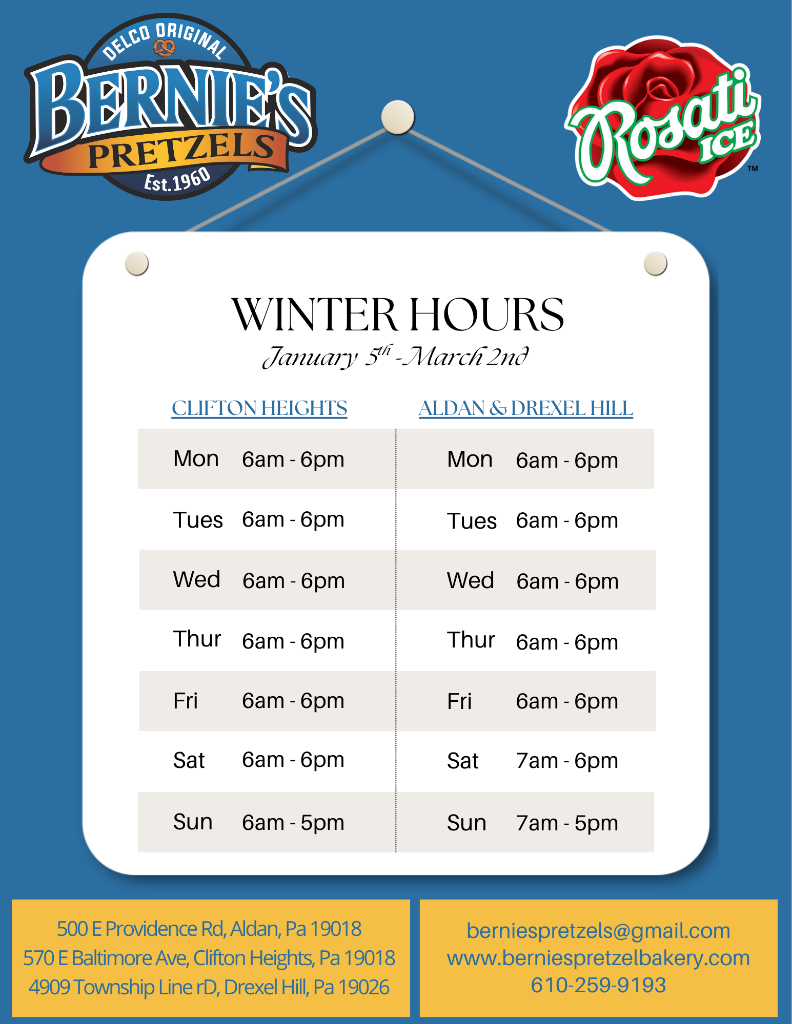 From Clifton Heights to Drexel Hill to our newly reopened Aldan (Penn Pines) shop, Bernie’s is serving the same golden-brown, pillowy soft pretzels your family has loved for generations. Fresh, local, and always made with the community in mind.