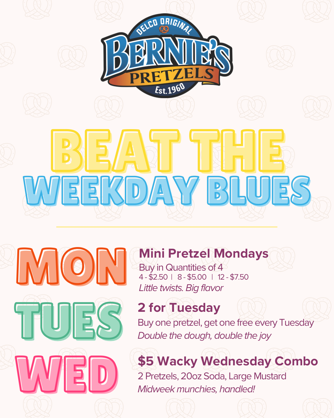 Bernie’s Weekday Specials are here to give you something delicious to look forward to!